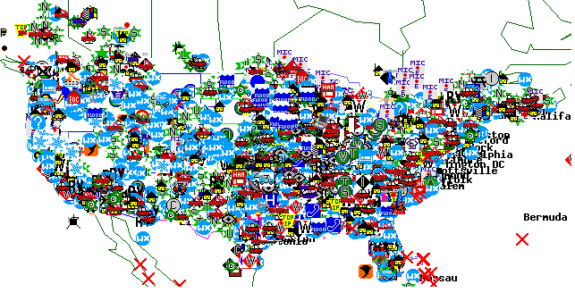 APRS is now in its 25st year! APRS is digital communications information channel for Ham radio. As a single national channel (see map at right), it gives the mobile ham a place to monitor for 10 to 30 minutes in any area, at any time to capture what is happening in ham radio in the surrounding area. Announcements, Bulletins, Messages, Alerts, Weather, and of course a map of all this activity including objects, frequencies, satellites, nets, meetings, Hamfests, etc. The APRS network has grown to most countries with strong Amateur Radio populations.