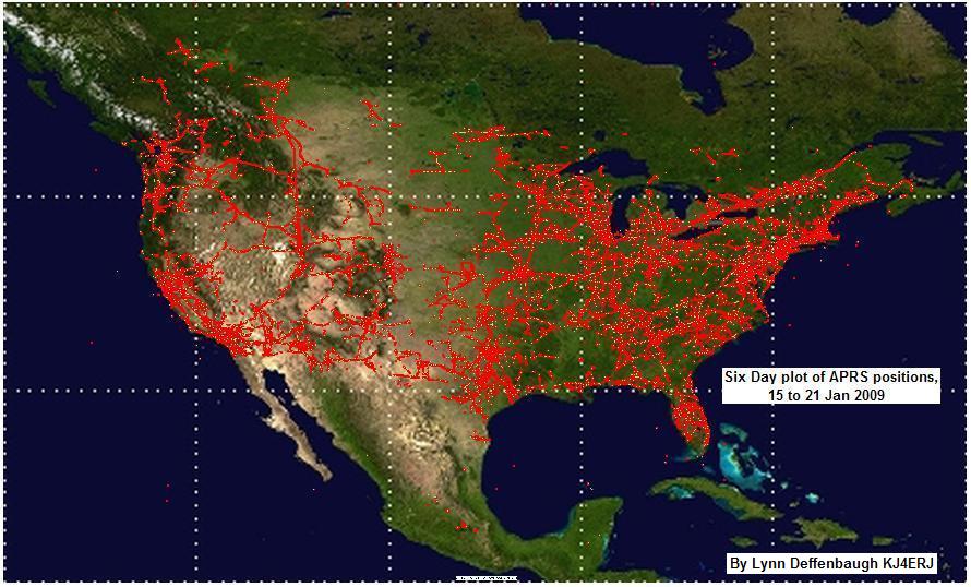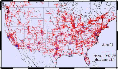 APRS Internet System (APRS-IS): Like most other Ham radio systems, APRS has been fully integrated with the internet beginning with the efforts of Steve Dimse and the Sproul Brothers in 1997. Currently there are many web pages for live viewing of APRS activity such as APRS.FI, or FINDU.COM. For example, the map at right from Hessu, OH7LZB's web site http://aprs.fi/ shows a one month snapshot of activity which reveals some gaps in the APRS coverage in the USA.