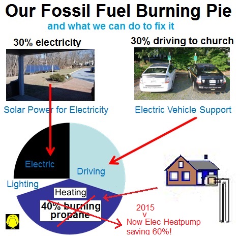 But... our building use is unique and unlike home systems. The building is unoccupied overnight and we have no full time staff nor day-school and so the heat is timed down to 58F at night and there is no ramp-up to 68F until the late afternoon and only on days when there is an evening meeting (Sunday excepted). Since the climate in Maryland averages 40F or higher outdoor temperature high in the afternoon during winter months, then, most of our heating (starting in the afternoon) is done at the most efficient time for an air-source heatpump. So we decided to go with a conventional air-source heatpump that would give us (in our unique situation) equal efficiency to geothermal at half the installation cost. Switching our heating from Propane to electric eliminated our average $4900 a year for propane and switched the energy to only an added $1500 for electricity for the heatpumps as shown in the above spreadsheet. Although this is 100% clean energy via our Wind contract with the utility, it is our intention to eliminate this with an addition to our solar array in 2017.