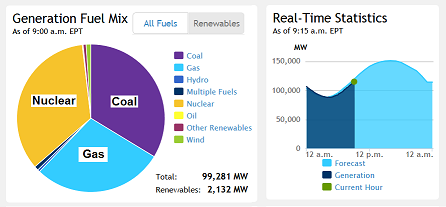 See the LIVE Energy production Supply and Demand in Maryland: The live PJM Grid Market web page shows the current demand and instantaneous cost of electricity. It varies from as low as 3 cents per kWh to as high as $1.25 per kWh depending on Demand and Supply. The figures on this page are in $/MWh so divide by ten to get the cost in cents per kWh that we are more familiar with. In Maryland, we typically pay a fixed price of about 10 cents per kWh which is $100/MWh at the wholesale market. The page also shows the grid mix of fuels and the production from Solar and Wind. It is fascinating to watch the huge variation of prices during the day.