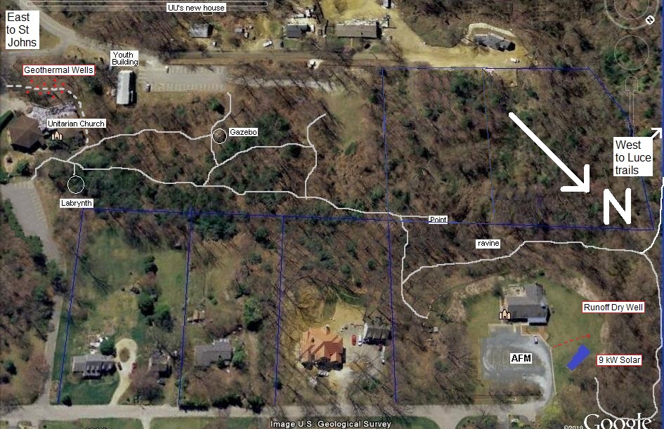 This trail not only highlights the nature around us but also our many initiatives to clean up our energy, our water and our air. Examples are our solar panels, our rain barrels, our permeable parking lot and rain gardens as well as the many Unitarian initiatives such as their geothermal heating and cooling system and new raingarden and permeable sidewalks.