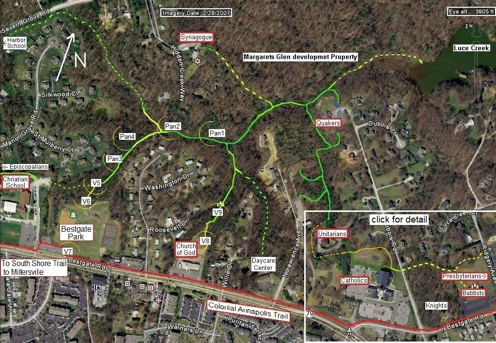 The Annapolis Friends Meeting is located in a natural area in the Luce Creek Watershed off of the Severn River. Their are no roads through the watershed, but there are about a dozen or so churches and other youth oriented areas surrounding the central natural area. As noted above, we have an initiative to connect our nature trails (shown below) to other Faith and Youth groups in the area.