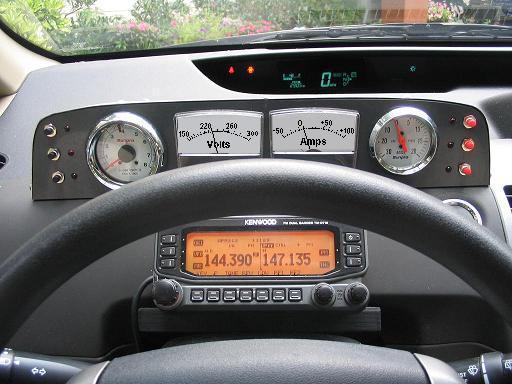 ANALOG INSTRUMENTATION: . The retro analog instrument panel (right) keeps me informed of not only the power going into and out of the Prius HV battery and solar panels, but also the economy of the gas engine via a tach and vacuum gauge. . The left meter is 150 to 300 volts and the right one is -50 to 0 to +100 amps. . (click for full size image). . This analog instrument panel is easier to use than a laptop for such displays. . The APRS ham radio below the dash is not related to this conversion but with an attached GPS provides tactical situational awareness of the positions, status and messages of similarly equipped mobiles in the surrounding area. The APRS network is linked to the internet and so you can always see where I am. Or using APRS, you can see where all the other Ham radio operators are with their bybrids.