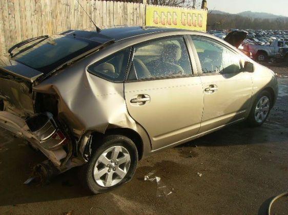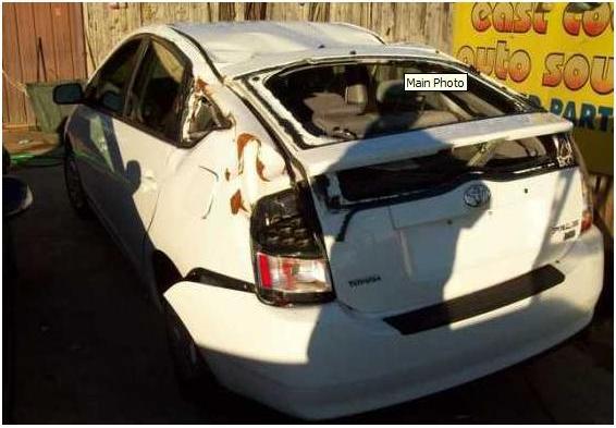 Re-cycled Prius #3: The next one below I snagged in Jan 2010 for my daughter's graduation present. Apparently crushed by a fallen tree. It is a 2005 with 92K miles on it. It sat in the junk yard for months but the junkyard dog would not go below $5500 parts value for it, since it was in 100% running condition and all normal crash-parts were perfect, just the squashed roof...