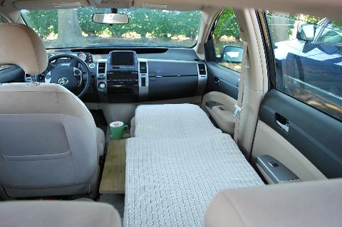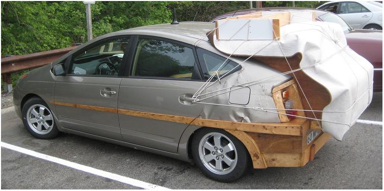 This is only a temporary configuration for hauling long distances in decent weather. It comes apart into three stackable pieces of wood, and then the tail-gate and hatch close normally for aerodynamic travel. But the interesting thing is, that still a carpet and one book shelf did not fit. So we added it on the top. The result is one of the worst looking aerodynammic arrangement you can imagine. Yet over the 300 mile trip on cruise control at 60 MPH, we got 46 MPG. Thats down about 10 MPG from normal, but still not bad compared to some lead-footed Prius drivers.