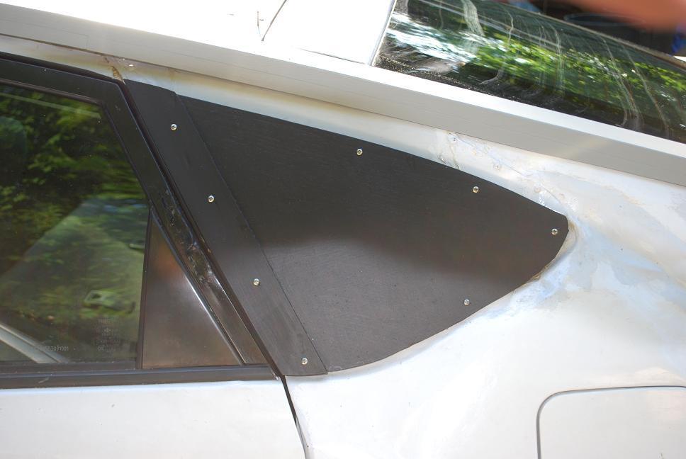 The left rear quarter panel still has lots of wrinkles. A little Bondo will fix that up someday... Notice, to date, other than a lot of sledge-hammering pounding, jacking and pulling, not one bit of normal "body work" has been done. No bondo, no filler, no nothing. Just hide it all under the solar panels, and then took a paint brush and white Rustoleum paint to the left rear quarter panel. Oh, and if you look closely, you can see that the left rear quarter window is a sheet of plywood painted black! (Oh, and the lower-half rear-window is also black painted plywood)... Now that I got it through safety inspection, I will use that plywood as a template to make it again out of 1/4" plexiglass to improve the view.