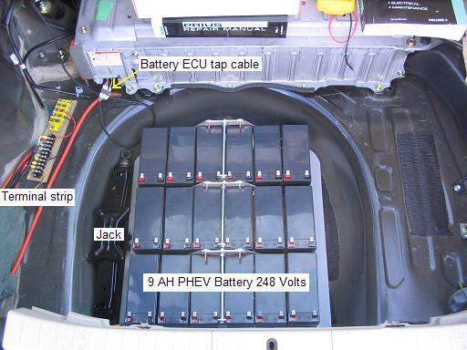 PHEV BATTERY: . The primary purpose of the PHEV battery in this conversion is not so much to guarantee longer range on electric alone, but to have a place to safely put the solar power without any risk of overcharging or over cycling the original Toyota HV battery. . The photo at right shows my added 9 Amp-Hour cells in the wheel well prior to being wired together in series.