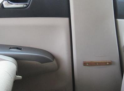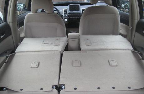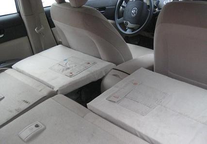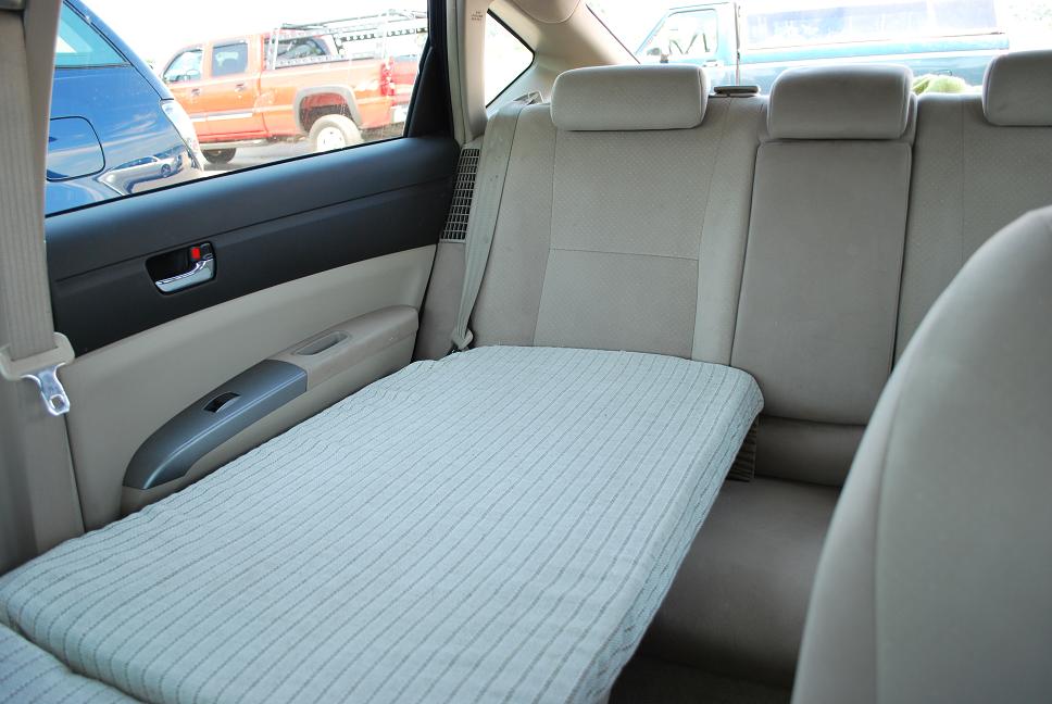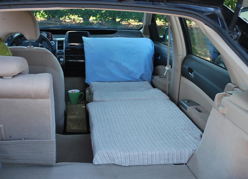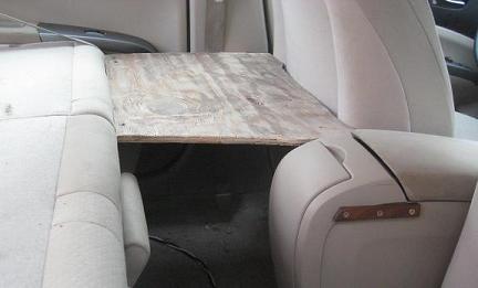PRIUS HOTEL: The better arrangemnt for sleeping is for two and is simpler than the Prius Inn. Rather than the three custom boards to make the front seat level, the Prius Hotel simply slides the seats forward and installs two boards to extend the back seats as shown below. Four small wooden supports are screwed to the plastic trim to support the boards. The rear of the boards rests on the headrests of the folded down rear seats. This arrangement gives 6' 4" headroom. Since I used Kakhi pants for the covering material, I left the pockets in place. These cover about 1" of hard foam. For sleeping, the entire area then is covered with a suitable foam mattress.