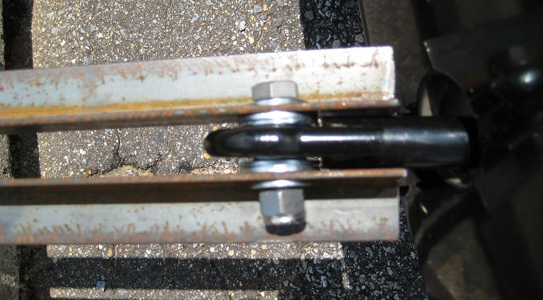 The parallel angle irons extend beyond the pivot point to maintain solid contact with the full width of the tow hook coming out of the bumper. This assures that there is little left to right movement so that the towed car will track the towing car. See the side view and a closer view. You can see that the bolt is tightly compressed to an internal spacer and 4 washers to keep the tight spacing for proper tracking.