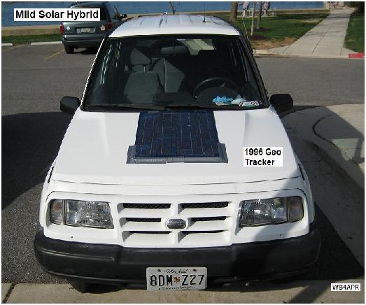 Mild Solar Hybrid: . My son's car is my second Solar Hybrid concept that attempts to reduce foreign oil dependence by improving fuel economy on a 1996 Geo Tracker. I call this a mild hybrid because it shifts some of the mechanical loads from the gas burning internal combustion engine to electrical loads and then uses solar power and plug-in techniques to make up the difference. Simply loosening the alternator and removing the fan belt improved gas mileage almost 15% from about 29 to about 33 MPG.