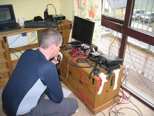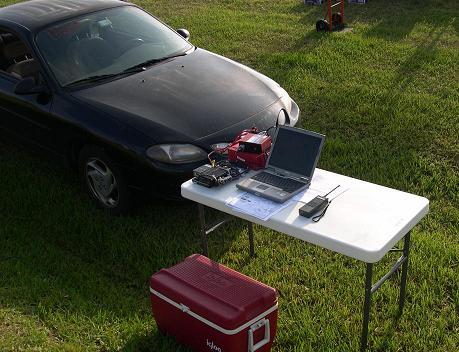 Other Data Entry Stations: But we should not lose sight of the home station that can also be used as a great information resource. The next photo shows a station that was set up in a motel room and the operators there could monitor all of the activities on the various nets and enter this situational information into their APRS PC's and all this data would show everywhere on APRS. . AND through the miracle of wireless (ham radio) they do not have to be at the site. . They do NOT need GPS and they can be anywhere convenient, just monitoring, and inputing and managing the data (that appears everywhere).