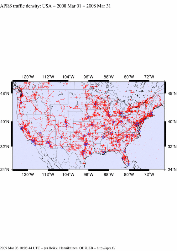 REMEMBER: If you are not using the full potential of APRS, it is not the fault of the protocol or the hardware. . APRS is a communication tool, not just an automated map. . Use it. But in most cases, that means ENTERING DATA, not just watching it. Also, even if you do not use APRS personally, make sure that your local area, club or organization does support a packet digipeater on 144.39 for those travelers that do transit your area. They depend on you for their connectivity, and local info, and may join your activities. The map below from Hessu, OH7LZB's web site http://aprs.fi/ shows a one month snapshot of activity. Look to see that your area is supporting these travelers.