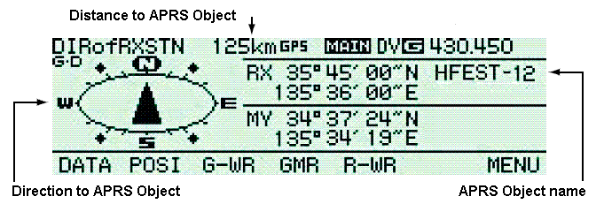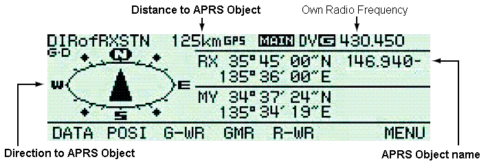 Pete AA5PL has done a lot of work in this area. Since the DSTAR radios can also display a remote callsign, the GPS position information and 20 bytes of text on their front panels, it seems that we should be able to figure out a way to display this same surrounding APRS local information on some DSTAR radios or attached devices and also on an attached GPS map. To explore the possibilities, below are some screen displays on the DSTAR radios and some concept thoughts...