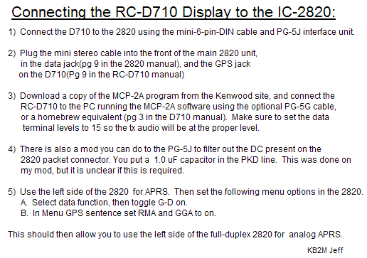 The RC-D710 Display Head only costs $199 and makes a nice APRS addition to any radio. It plugs into the TX and RX audio of any radio and turns it into an APRS radio just like the TM-D710 full function APRS radio. It would be nice to find a 10V regulated source inside the 2820 to power the RC-D710 display, otherwise you also need to purchase the PG-5J Cable/Regulator for about $87 to power the display head. It takes 300 mA at 10 volts regulated.