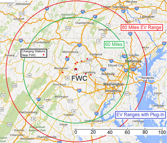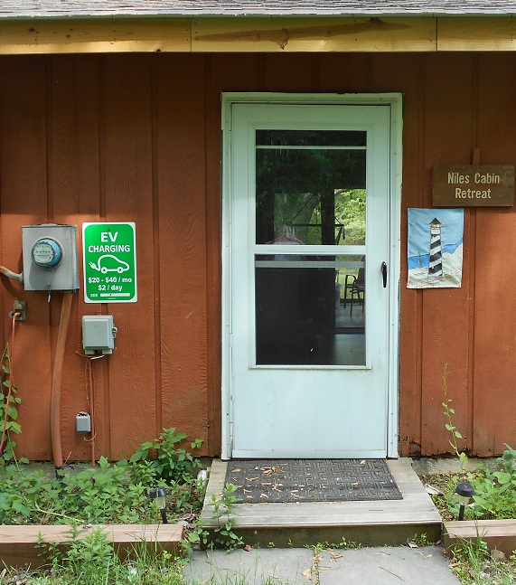 Friends Wilderness Center: This retreat center places the sign over the convenient outlet to support vehicles traveling to the camp from up to 80 miles away as shown in the map. EV's coming to the camp can be assured that they can plug in during the weekend and have a full charge for the trip home. To replenish an 80 mile charge, the car will need 20 hours, but that is fine during a weekend visit when the car is parked the whole time. Total cost about $3.