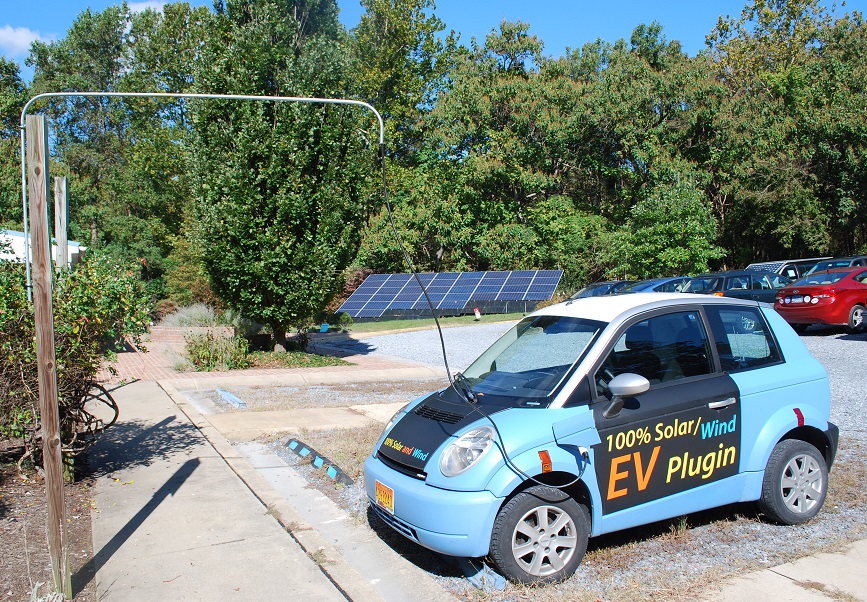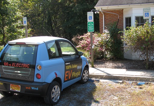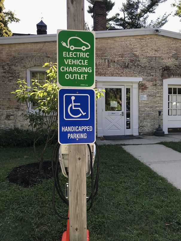 Charging While Parked: Most EV owners know (or are learning), and even the Maryland Governor's EV Infrastructure Council has determined that 97% of Electric Vehicle (EV) charging at-work (or play) can be satisfied by simply plugging EV's into standard 120V outlets while parked. With more and more people considering driving an EV for local travel and commuting, we need to be ready for this new clean energy transportation. In stewardship of the Earth and in testimony to peace to prevent future wars over diminishing oil supplies, many businesses, churches, and non-profits have added Charging Outlet signs over their existing outdoor outlets. For example, the Annapolis Friends Meeting outlets shown below.