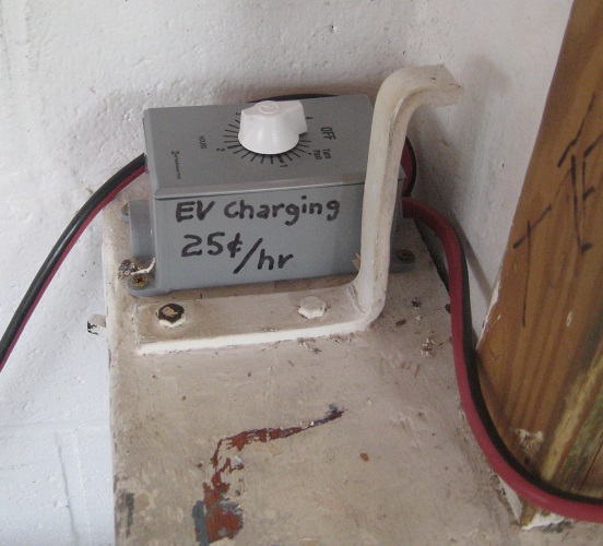 Churches, Schools, Motels, Everywhere: This page shows the grass-roots movement to get EV Charging Outlet signes in Church, School, Motel, Office, Retail and Recreation parking lots wherever existing 120v outlets exist. These outlets can provide top-off EV charging to customers and visitors to encourage them to drive their EVs to these facilities. All EV's come with a standard 120v cord for topping off at any convenient outdoor outlet or extension cord. The cost of electricity is about 20 cents an hour and this is easily met with a contribution or donation. And there are no installation costs, since the outlet already exists. And there is no risk. It would take five hours just to steal $1 worth of electricity and is simply not worth it to the car owner to waste away 5 hours just to steal $1.