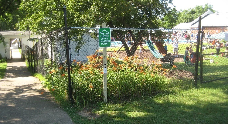 Country Club Estates, Glen Burnie Swimming Pool: This sign is particularly valuable for the education of the public because it has posted the actual cost to charge. The cost of 25 cents an hour can easily be collected by the Lifeguard who has to collect a swimming fee or log everyone through the gate anyway. She just twists a timer from 1 to 4 hours depending on the fee paid. The actual cost of electricity is only 20 cents an hour for an EV, so the extra 5 cent handling fee (tip) was part of the incentive to make up for the life guard time and effort.