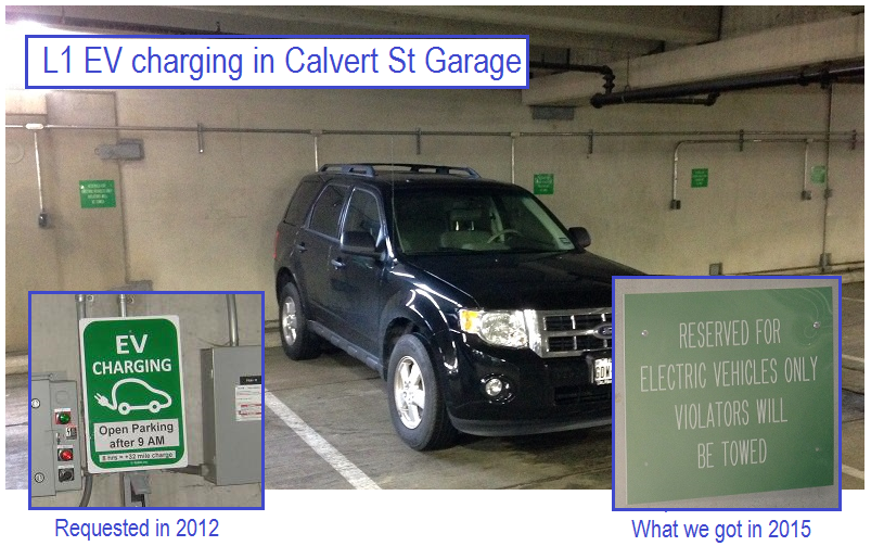 Example Problem Signage: Here is an example of how not to do things. For years we pestered the State to recognize the 36 standard L1 outlets in the Calvert Street State parking garage with signage (after of course, isolating the circuits and only putting up one sign on one outlet per circuit). We also recommended against making them exclusive by allowing non-EV parking after 9 AM as shown in the image here. But 3 years later, the result was 8 new individual outlets (good!) but also 8 new thou-shalt-not-share EV exclusive signs (bad).