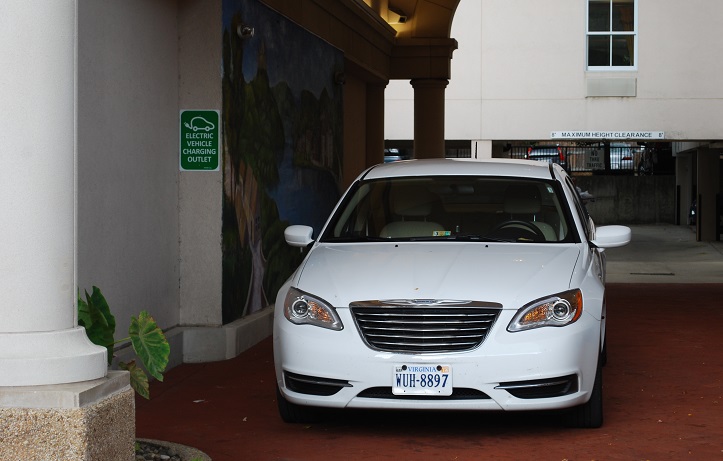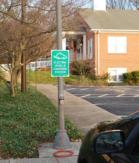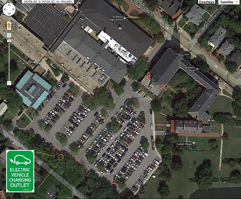 Annapolis St. Mary's Catholic Church: has a very active environmental committee that has invested in significant storm-water runoff collection in their parking using attractive rain gardens in the medians and along the down hill borders. In the Fall of 2012 they installed a Charging Sign over an available outlet that is also ideally located in a highly visible location but some distance away from the building entrance as shown below. This kind of location is ideal for EV charging because it improves the chances that the spot will not be occupied by some gas car blocking access to the EV in need.