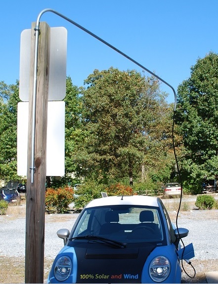 Getting Across a Sidewalk: Annapolis Friends Meeting added a level-2 EVSE closer to the building than the two L1's at top of page (so we didnt have to run a new trench and to provide faster charging), we mounted a bent piece of 1/2" conduit on a handicapped post to swing out and hold the cord over the sidewalk as shown above. On the right, when not in use, it swings back over the bushes. The height should probably be at 7 feet since that seems to be the height of all the commercial awnings that overhang from various business in downtown, so that is probably the code, though I couldn't find it. Notice also how our meeting house is fully solar powered (and hence charging too) from our 9 kW array in the background.