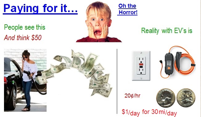 Paying for it: Everyone is familiar with the weekly pain-at-the-pump where the typical gas tank fill up costs on the order of $50. What most people dont realize is that a typical fill-up for an EV (plugging in for 5 hours) only costs a single $1 as shown in the cartoon at the right. But that is the point... EV's like to plug in whenever they park. And making existing outlets available and a means to pay for it is the point of this web page.
