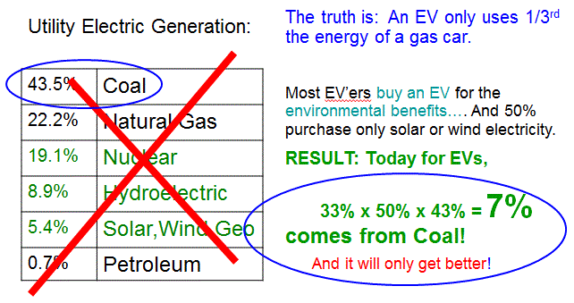 EV's depend on Coal: No. Most don't. In addition to the fact that more than 50% of EV owners