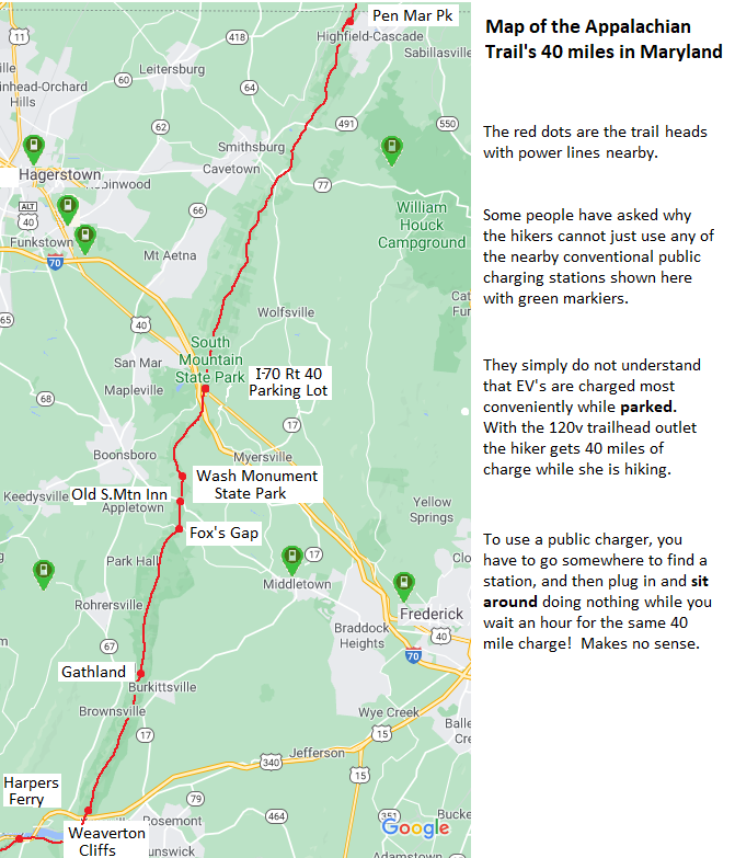 at the several trail heads in Maryland to encourage a slow top-off L1 charge from 100% clean electricity for EV hikers to compensate
