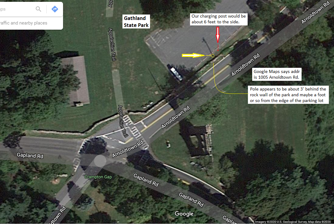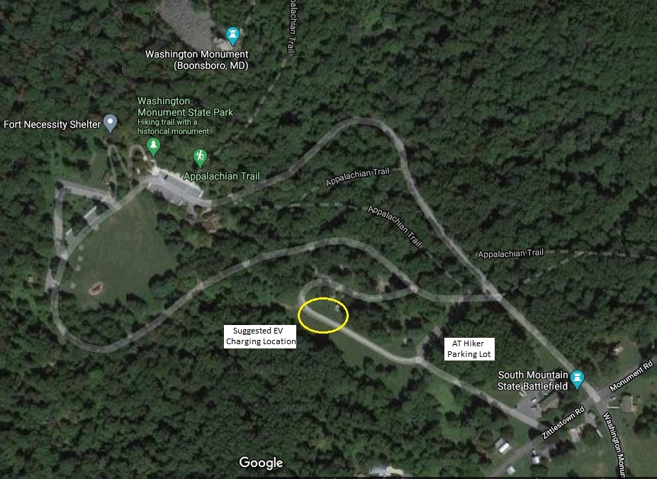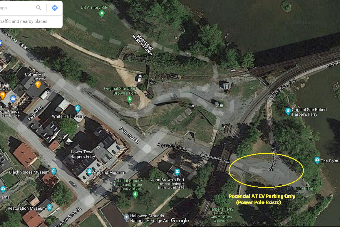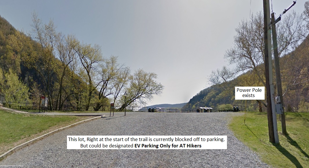 Harpers Ferry has an ideal Parking Area for EV charging right at the start of the AT trail crossing the railroad bridge.
