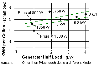 Prius Generator Economy: The Prius (using this 1 kW inverter on its 12V battery) appears to generate electriciy just as efficiently as a small gas generator. The plot to the right is based on Bob Wilson's conversion for the Prius plus the published gallons per hour for 5 common emergency power plants sold at Home Depot. The chart shows the comparison KWH per gallon and shows two green lines that seem to bound the trend (except for the higher efficiency of the 3750 W plant). Each of the generators (except the Prius) was running at half-rated load. Although the Prius rated generator is 50kW, in this example we are only using a 12 volt 1 kW rated inverter, so the 1 KW point is FULL load. Whereas the Prius 800W point is operating at 80% and is 10% better than the 1850 W unit. Please note, all of the units greater than the 1850W generator will show WORSE efficiency when operated at only 800W, so the Prius is one of the best at the desired load of a few lights, and the home's oil or gas furnace blower.