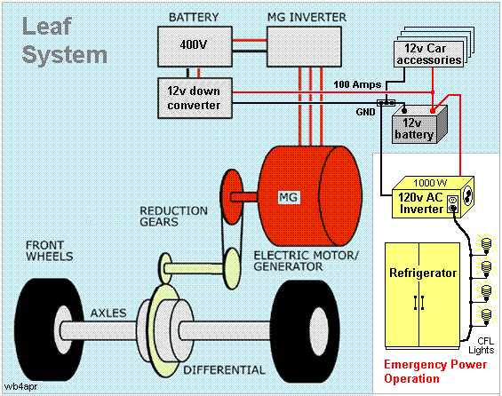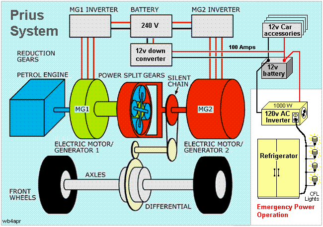 PRIUS POWER BACKGROUND: The Prius has a 12 volt electrical system for normal car accessories, a 220 Volt 7 Amp-Hour Battery for propulsion assistance, a 50 kW motor-generator, a 50 Kw DC/DC converter/inverter, a 2nd motor-generator, and a 76 Hp gas engine all integrated into a seamless power system as shown at right. See also a Leaf system. Just hook up a 1 kW innexpensive ($100) AC inverter to the 12v battery to power your emergency needs as shown. . When the ignition is "on" (called READY) in the Prius, a built-in 100 amp DC/DC converter is powered up to provide 12 VDC to all normal car circuits and accessories. . In this READY state, the Prius engine will warm up, and then shut down. . It can remain in this state indefinately and provide plenty of electrical power and, as the energy system is depleted, the engine will automatically start to maintian the charge on the battery. . It can maintain this "READY" state indefinately until the gas tank is empty. See more on my Solar Plug-in Prius
