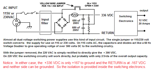 220 VDC Switching Power Supplies: . The reason distribution at 220 VDC is simple is beacuse almost all modern power supplies are designed using switching regulators to elminate the large, heavy and bulky 60 Hz power transformers. These switching power supplies work on DC input that is obtained from 115 VAC or 230 VAC via an input rectifier as shown above. . These supplies when set to the 230 VAC position will also work well on 220 VDC.