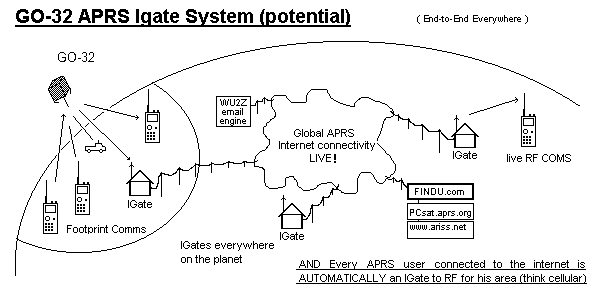 GO-32 APRS CAPABILITIES: GO-32 was designed with the file store-and-forward system called the PACSAT protocol. This protocol is ideal for delivering files and data, but is usually not ideal for real-time human-to-human contact, position reporting, or short messaging. . With APRS digipeating, however, real-time mobile-to-mobile contacts are much easier to conduct.