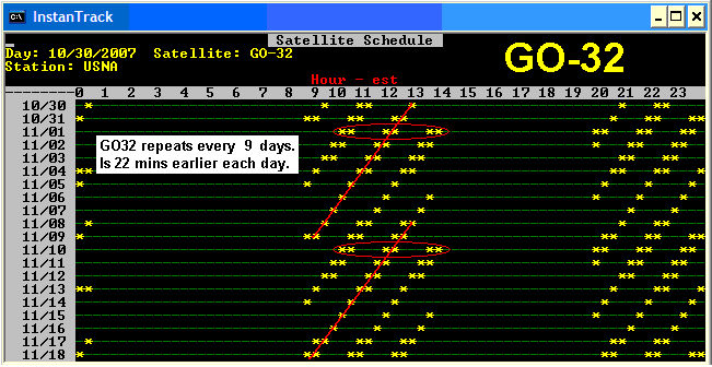Tracking GO-32 is easy and does not need a computer. The ground track repeats every 9 days as shown above so you only need a simple table for your area and you can predict passes any day. . In fact, manual tracking works for most LEO satellites. . See my Manual Tracking WEB page for more details. . Since GO-32 repeats its ground track schedule every 9 days the table below can tell you the pass time for any pass for the next 6 months: