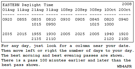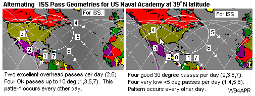 ACCESS TIMES: GO-32 is sun synchronous and so it comes over everywhere three times between about 8 AM to Noon and again between 8 PM to midnight local sun time. . During these two windows at least one pass each will be an overhead pass which might also work for an HT. . The other passes will be lower to the East or West and will work fine for a 50W mobile.