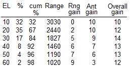 The following table is a plot of overall gain for the elevation angles shown. Notice the cumulative percent column showing 96% of all pass times are below 50 degrees. This shows how a beam aimed about 10 to 15 degrees above the horizon will give you maximum gain on the horizon where you need it most, and yet still give you a good signal all the way in closer and higher to overhead. As the gain of the beam drops off at high elevation, that gain is made up by the satellite being much closer. Tilting an antenna any higher than about 15 degrees will sacrifice gain where you need it most (on the horizon), and give you gain where you need it least. Of course, if you cannot see the horizon from your location, then a higher up-tilt makes sense, but then, a smaller antenna probably 3 or 4 elements will do since the signals will be so much stronger..