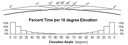 Another way to look at the same geometery is to plot the percentage of time that the satellite is within each ten degrees of elevation as shown to the right. Now let's superimpose a typical 6 element beam antenna pattern pointed at the horizon on the above range and angle plots.