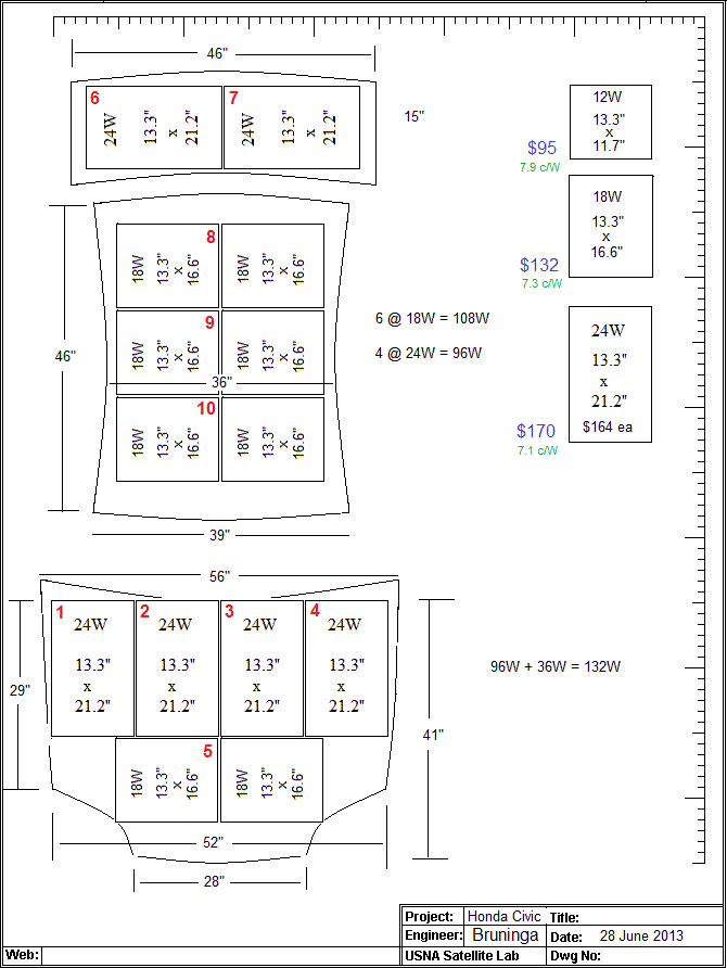 To t he right is the drawing for the solar plan for the Honda. I included the added two panels on the trunk since I will probably drive it a while before I make the Truck-E conversion. ANonther problem is the recessed nature of the front of the truck-bed panel. In all situations except due south, the sloping real roof pillars will shadow some cells, and we all know that this knocks out the entire array. Maybe I will dig into the back of the panel and bypass those vulnerable cells?