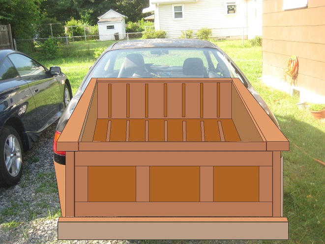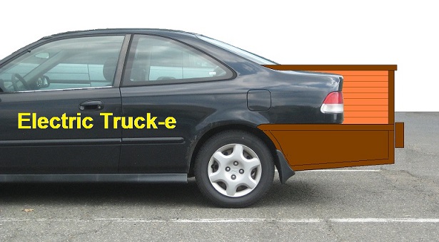 Truck-E Concept Takes Shape: But then I realized, I'd never take apart a working EV and so I begain to think about how to make this Honda as spiffy as an MGB. I came up with the Truck-E concept below. Not only does this give the EV some eye catching appeal, but it also gives me a place to install a standard 40" by 65" home solar panel. The Panel becomes the truck-E bed cover!