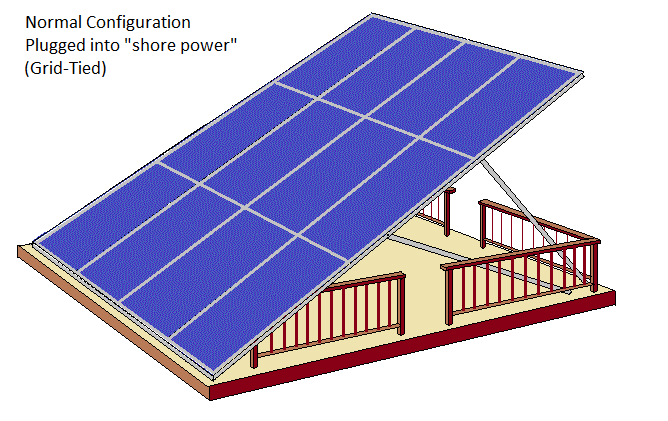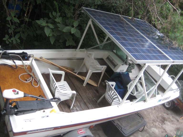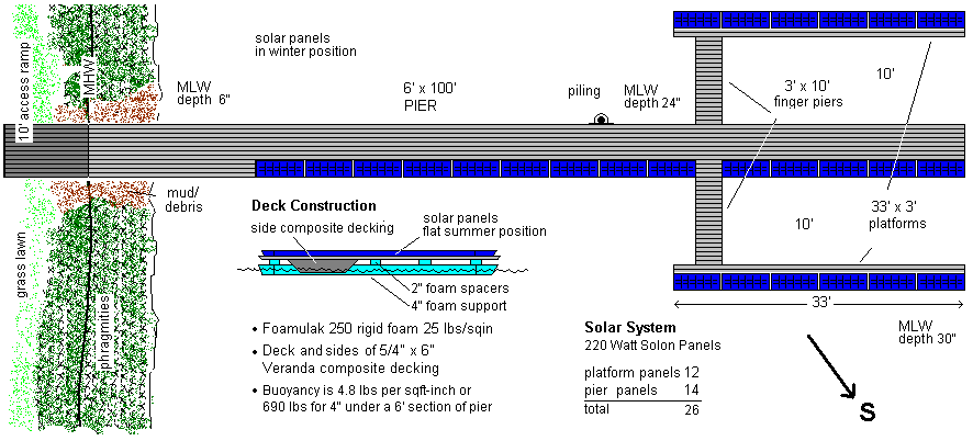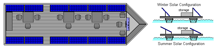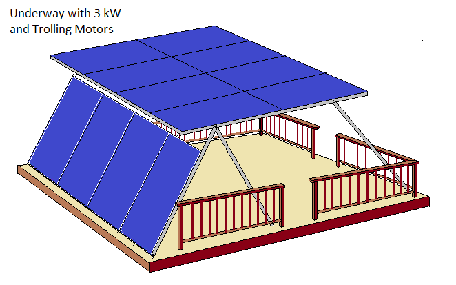Solar Electric Boat: Before I finally got the law changed for solar-on-piers, my first idea was was to build a Solar Boat floating on foam insulation which contains a similar number of panels providing not only propulsion when underway, but also an additional 2.8 kW of charging power when moored. See the sketch. The structure on the boat would fold down for storage. Accessories would be stored flat while the boat was moored. . The sunward panel is kept at its high winter position while underway and the shadow side is tilted almost 180 degrees to face outward and provide a nice side to the boat, or power when the sun is on that side. When moored, all the structures would be folded down and both arrays tilt to the sun at the proper angles for summer and winter as shown here.
