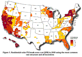 Solar Energy is now cost effective in every state in the USA! The 2009 map (above right) showed which states had the most favorable return-on-investment (see original report). Reds broke-even when solar costs were $9 per watt. Orange at $6/watt, yellow at $5/watt and all rest of the country (white) became cost effective at $4 per watt back in 2011. Since costs are now below $4/W installed in some areas and as low as 75 cents/watt for do-it-yourselfers, now it is impossible to ignore the positive environmental and economic benefits of solar. Solar is here and is a major player in our future. See the interactive Solar map of the USA. The wind map is even more impressive!