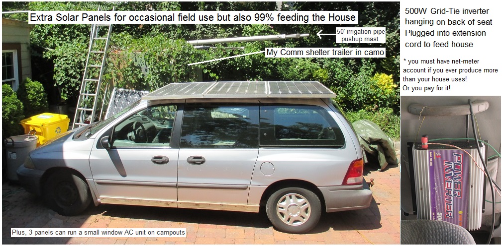 All Panels Contribute: Once you have a NET-meter grid-tie account, remember that any panels you have laying around can also be hooked up to your home as shown above. I have an amateur radio communications trailer, and a solar trailer and a solar boat and four left over panels in my driveway. All of these intended uses for portable operation are vital but are also less than 1% of the time. By hooking these other solar panels on my property to the house via small 120v grid-tie inverters, their power the other 99% of the time is also captured to further reduce my electric bill. Since that photo was taken, the 4th panel in the picture now rests on the windshield but with a hinge assembly so it can be flipped up and over the roof panels for travel.