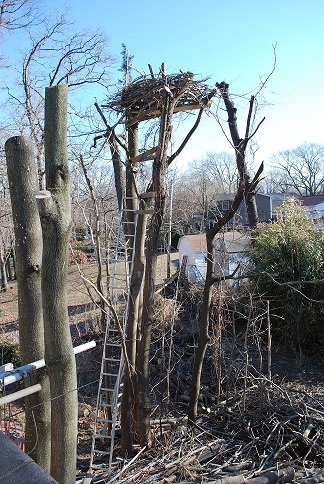 Eagles Nest: Since my original arrays faced Southeast, in Spring 2014, I added another 3 kW array facing Southwest on top of the garage. Since this new array begins to get full sun in the afternoon at the same time that the SE arrays begin to be shaded, I was able to simply connect them in parallel to the same inverter. This way, I doubled my power production with no increase in inverter cost. See full description. But to clear the roof for solar, I had to top off the SW trees and the stubs left standing seemed ideal as a support for an Eagles nest. So we built it, including camera. But missed the nesting season this year. So far, no guests... Maybe next year.