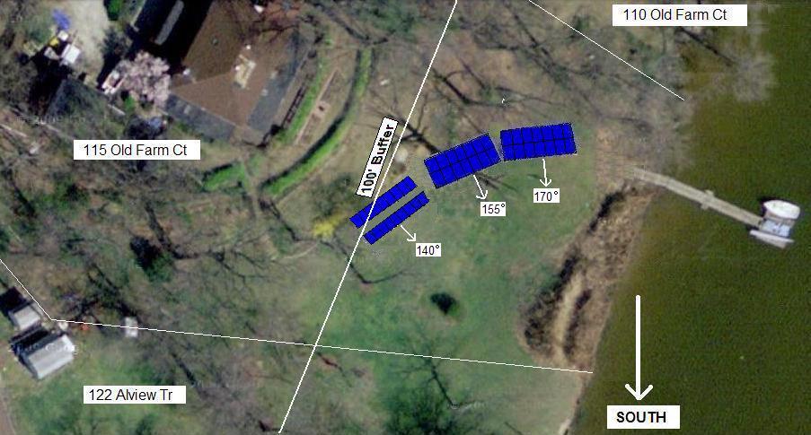 Plan-C Solar-in-Yard: 21 Dec 2010 - So, after 9 months and $2000 of fees, the MDE's denial of panels on piers still stood. So I designed the panels to sit on the only sunny part of my lawn down by the water as suggested by the Secretary of MDE... "on an upland alternative". (My roof is more than 50% shaded throughout all times of the day and most months of the year.) So we submitted a building permit application in September 2010 only to be immediately DISAPPROVED! Maryland does not allow anything to be built within 100' of the shoreline. So, with additional fees, I applied for a Variance. On 21 December 2010 I appeared before the Hearing Officer and presented my case. Here are some of the materials I used: