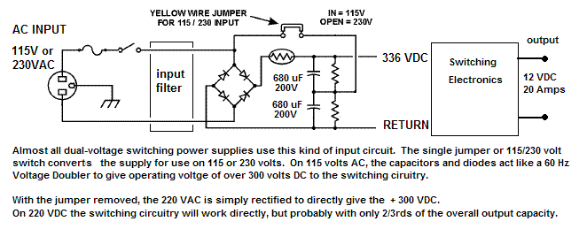 220 VDC Switching Power Supplies: . The reason distribution at 220 VDC is simple is beacuse almost all modern power supplies are designed using switching regulators to elminate the large, heavy and bulky 60 Hz power transformers. These switching power supplies work on DC input that is obtained from 115 VAC or 230 VAC via an input rectifier as shown above. . These supplies when set to the 230 VAC position will also work well on 220 VDC.