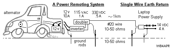 Long Distance Power Distribution: Under Emergency conditions, for much longer distances, power can be distributed using a Single Wire Earth Return or SWER system. I have a 6" spool of #20 wire that is 3200 feet long takes up less room than the 100 foot spool shown. Using it and a few ground rods, a few hundred watts can be delivered over nearly a kilometer to power a typical emergency amatuer radio station.. See my APRS SWER System