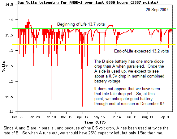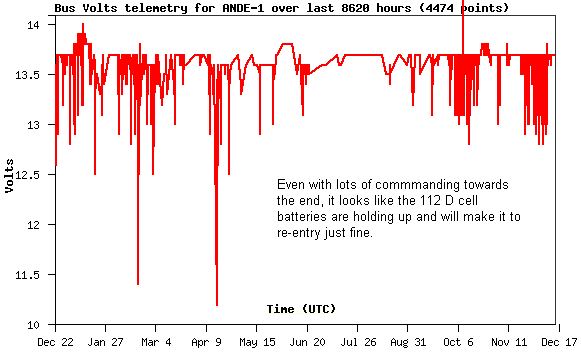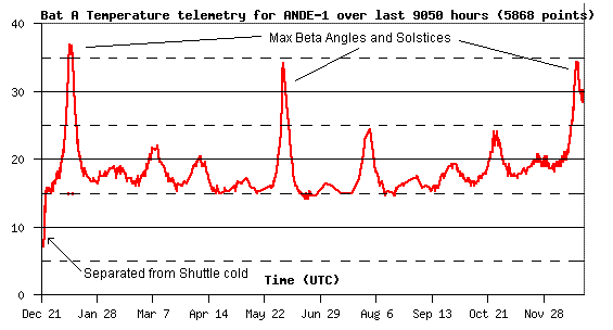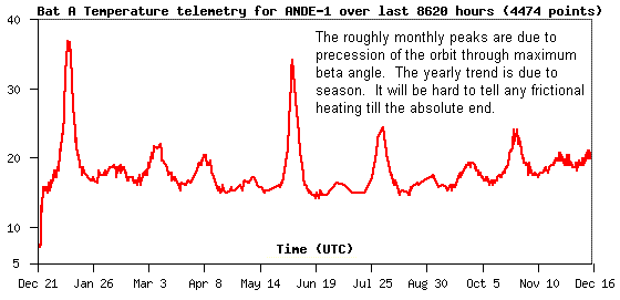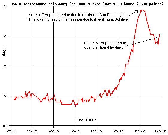 ANDE RE-ENTRY 25 Dec 2007: Re-entry was at 0724z +/- 15 minutes with last radar observation by SPASUR at 0443z. . The last packets were heard on the 24th at 2054z. . The final telemetry over the last 24 hours did show about 2 degrees of re-entry heating over nominal temperature. . The nominal temperature at the time were high since the peak solar beta angle happened to coincide four days earlier with the winter solstice, giving the maximum solar exposure as shown below: