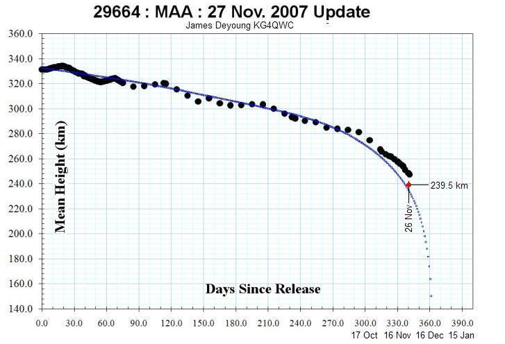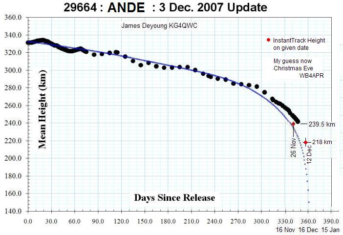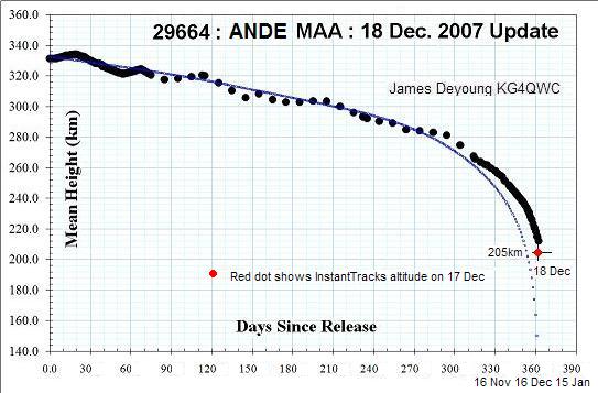 Operations Contest: . PA3GUO and DK3WN are sponsoring an ANDE Operations Event and contest to encourage operations and reception of telemetry. . So activate your ground station so that we can collect as much final telemetry as possible. . We do anticipate that the primary batteries for ANDE will last through end of mission as designed. . See Battery Analysis, and 13 Dec update, and Temperature... . The plot below is the updated expected decay altitude. . The dotted blue curve is the original curve computed at launch a year ago. . The black updates are from KG4QWC and the red dot is what Instantrack shows me?.