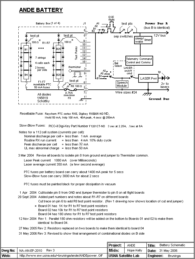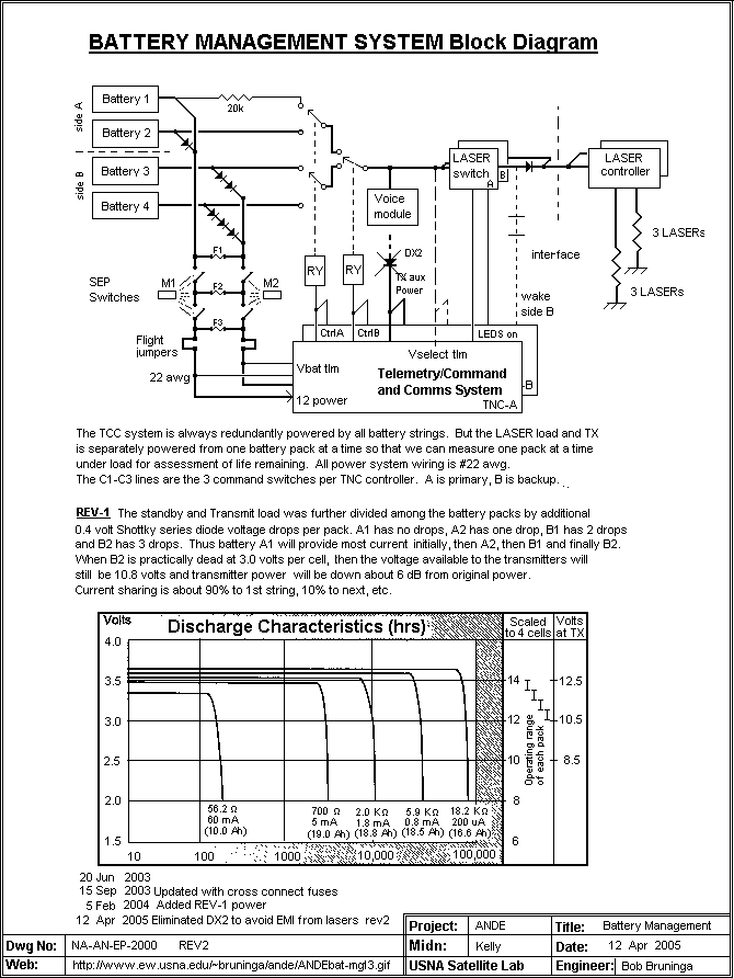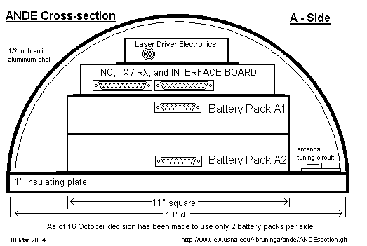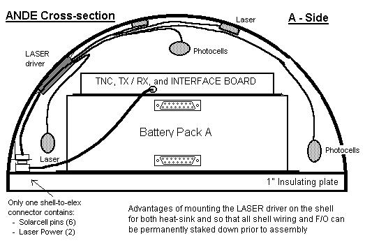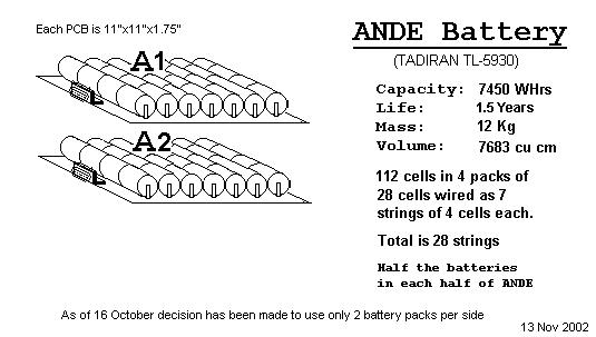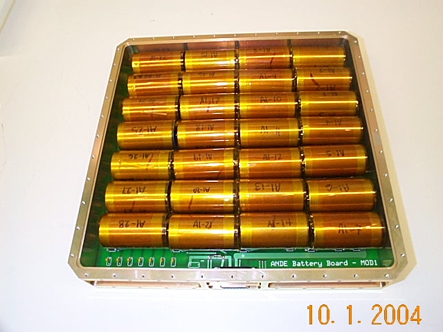Lithium Primary Battery Power System: Another unique requirement of the comm system was to operate for up to 1.5 years on primary batteries without any solar cells or external charging. Thus, ANDE runs on 112 "D" cell Lithium thionylchloride cells arranged in 4 packs of 7 strings of 4 cells in series. To meet the man safety requirements for launch on the shuttle, extensive testing has been conducted.