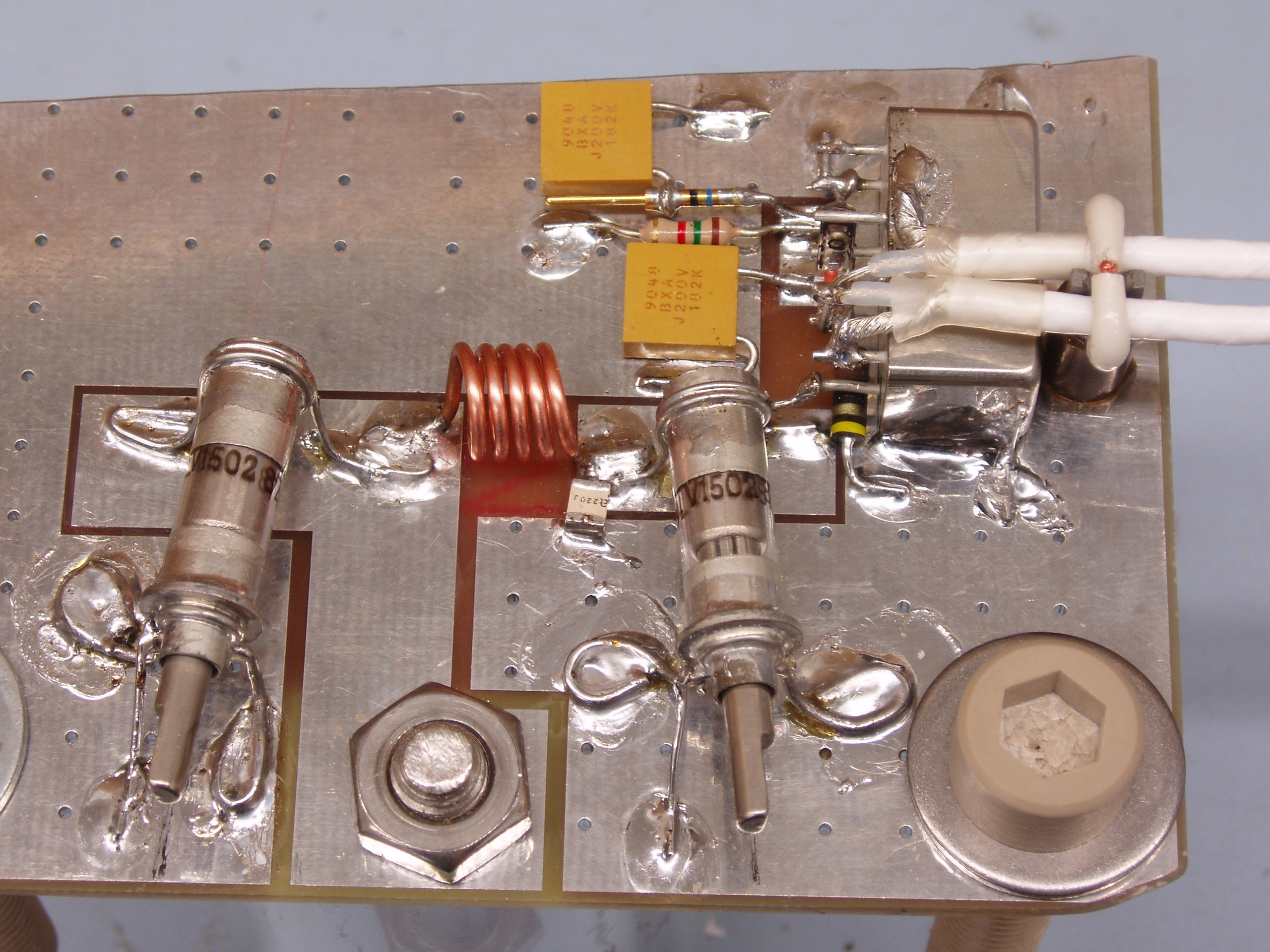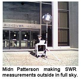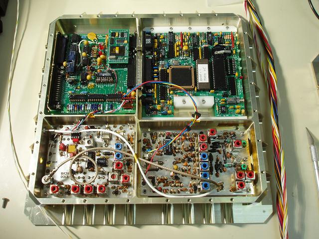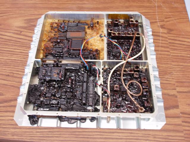This is after a significant set-back 27 May 05, when the finished Comms modules as pictured above were burned to a crisp the night before delivery by a failed 60C heat-chamber thermostat. See photo. On 29 May we began ordering parts and completely re-built it and delivered the second complete system by 13 July 05. As shown below, the final tuning of the spacecraft as an antenna occured on 15 Aug 05 and got an amazingly good 1.2:1 SWR!